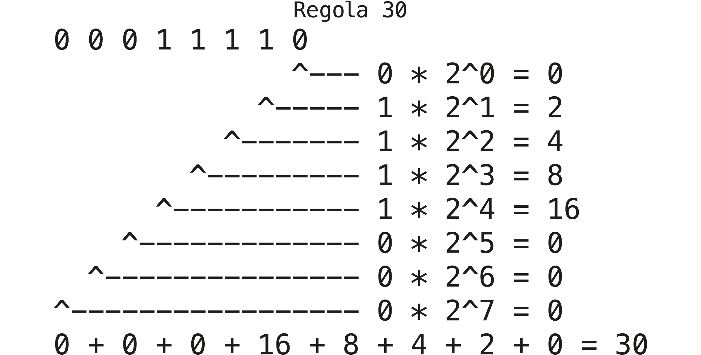 il numero 30 della Regola 30, ad esempio, è 00011110 in binario.